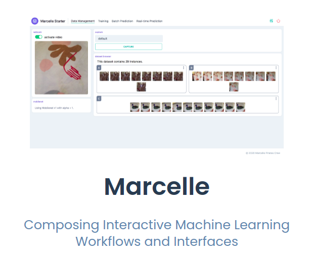 N.B: Marcelle est développé à Saclay par J. Francoise, B. Caramiaux et T. Sanchez. Vous pouvez aller sur le site pour tester les exemple vous même (ne fonctionne pas sur mobile): https://marcelle.dev/.
