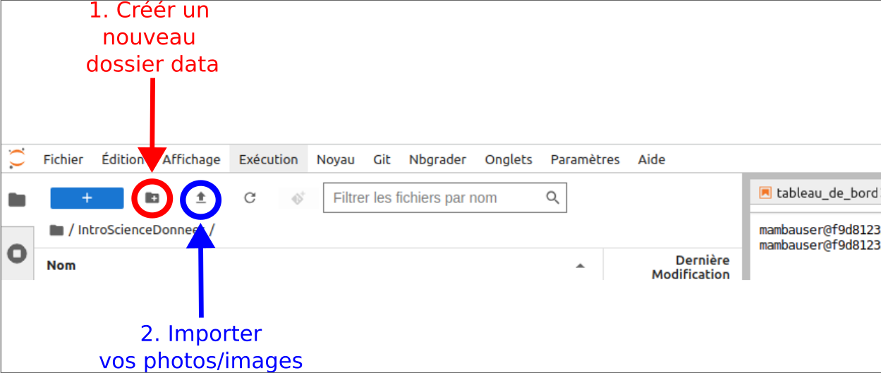 datade~/IntroSciencesDonnees. Vous pouvez pour cela utiliser les boutonsNouveau dossieretChargez vos donnéesdans la barre de gauche de JupyterLab. Voir la figure avec les consignes en rouge et bleu respectivement. Notez que vous pouvez faire cette opération directement depuis votre téléphone.