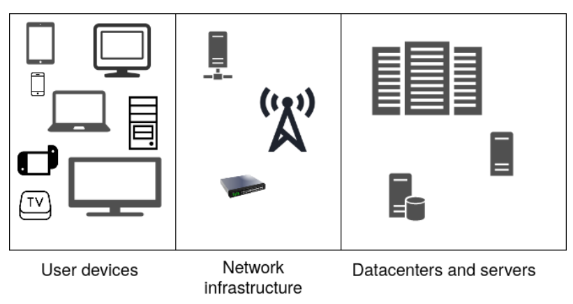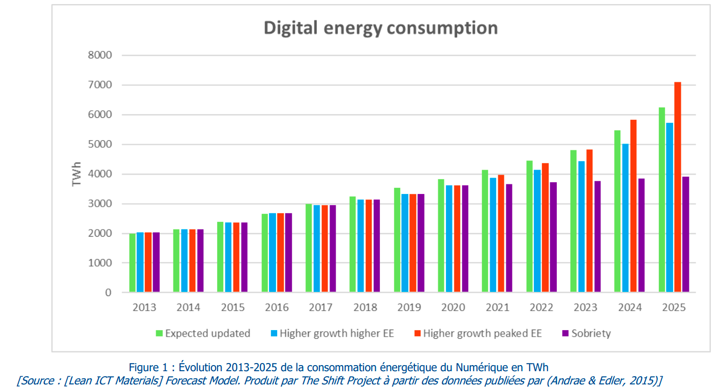 10% de la consommation éléctrique en France vient des services numériques. Les objets individuels (ordinateurs, téléphones portables écrans etc.) sont ce qui consomme le plus à l’échelle du Pays (~70%)