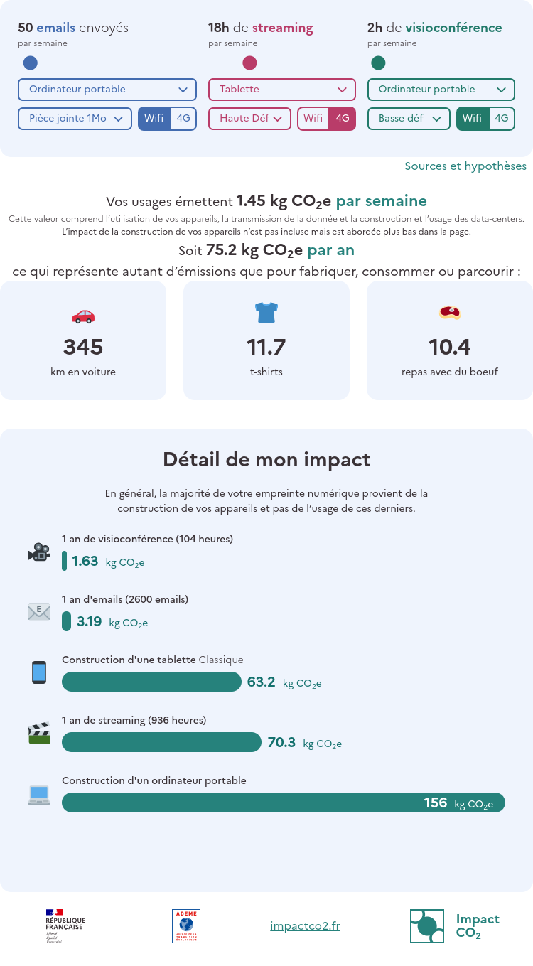 L’ADEME (Agence de l’Environnement et de la Maîtrise de l’Energie, créée en 1991) propose des moyens de calculer l’empreinte carbone de nos usages numériques (vie professionnelle ou personnelle)